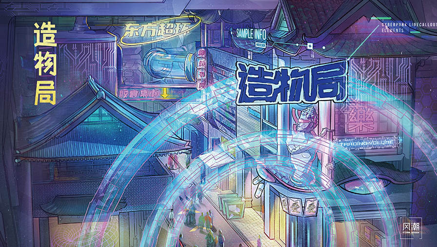 《周禮?春宮?大宗伯》講禮器:“以玉作六器,以禮天地四方,以蒼壁禮天,以黃琮禮地,以青圭禮東方,以赤璋禮南方,以白琥禮西方,以玄璜禮北方?!币虼松虾oL(fēng)潮創(chuàng)研團(tuán)隊(duì)以中華五色為基礎(chǔ),分別對(duì)三大產(chǎn)品世界觀(guān)進(jìn)行色溫色相的選擇與調(diào)整,在國(guó)風(fēng)、國(guó)漫、東方賽博等不同場(chǎng)景甄選出適配的獨(dú)一無(wú)二的五色體系。